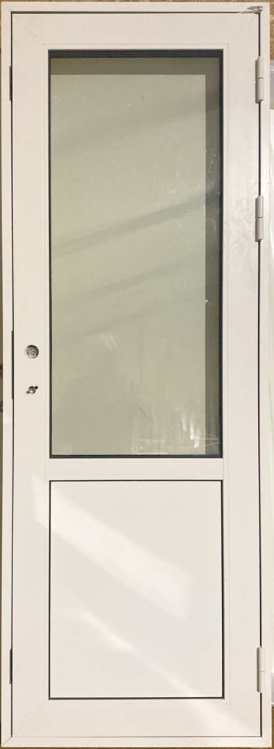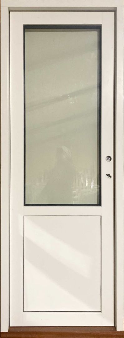 Ny og ubrugt træ/alu facadedør med 3 lags lavenergiglas – hårdttræs bundstykke og højre udadgående.