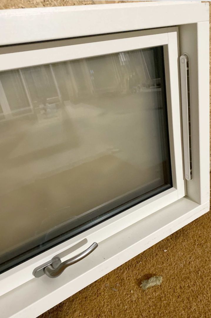 Ny og ubrugt træ/alu badeværelsesvindue med 3 lags lavenergiglas og udluftningsventil.